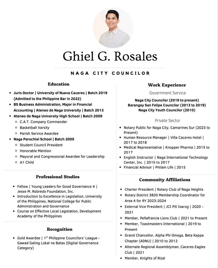 HON. GHIEL “OYING” G. ROSALES is a third-term City Councilor of Naga City presently serving as chairperson of the committees on Laws and Ordinances; Rules and Privileges; and Cooperatives Development.